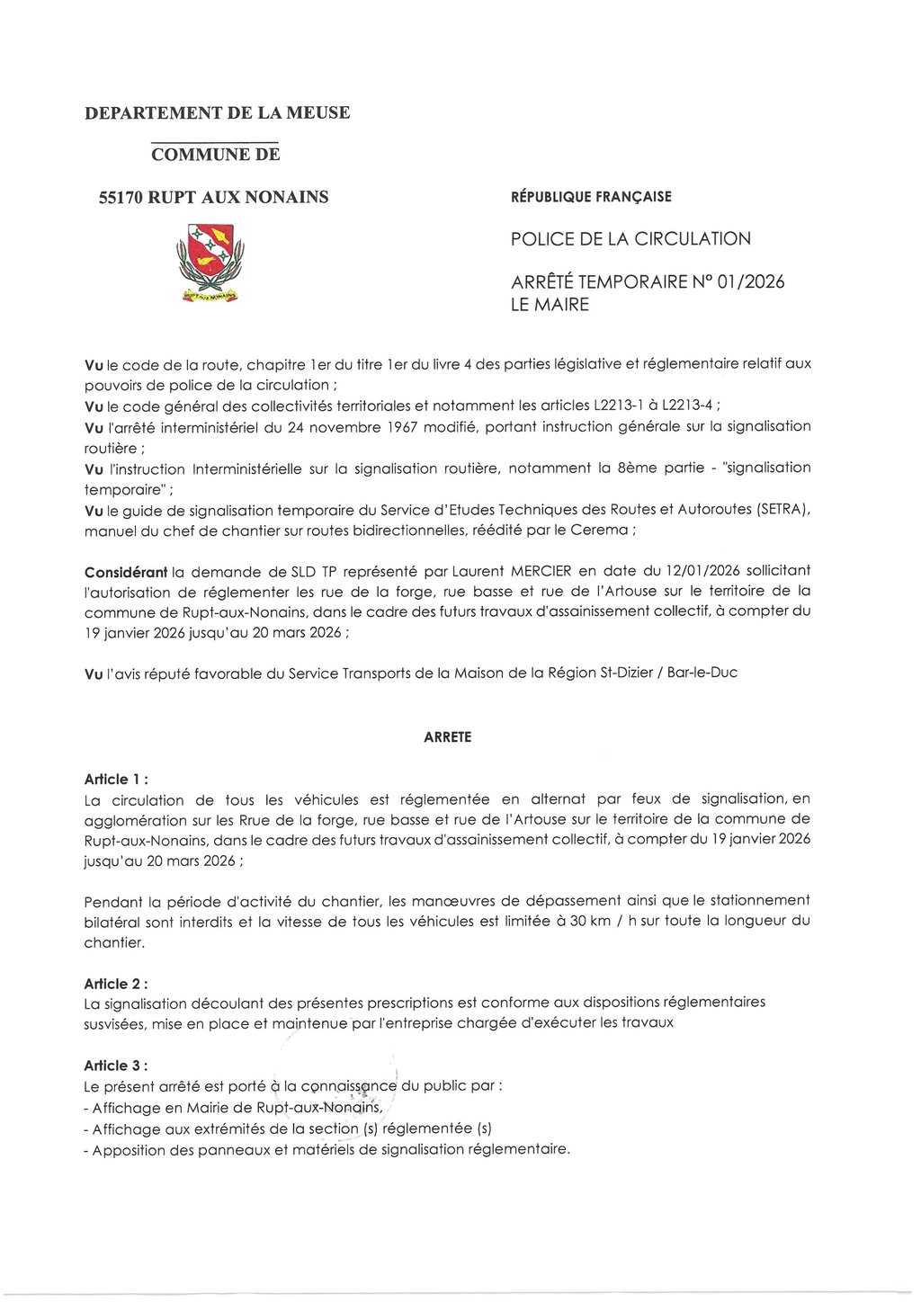 ASSAINISSEMENT COLLECTIF - ARRÊTÉ DE CIRCULATION 19 JANVIER