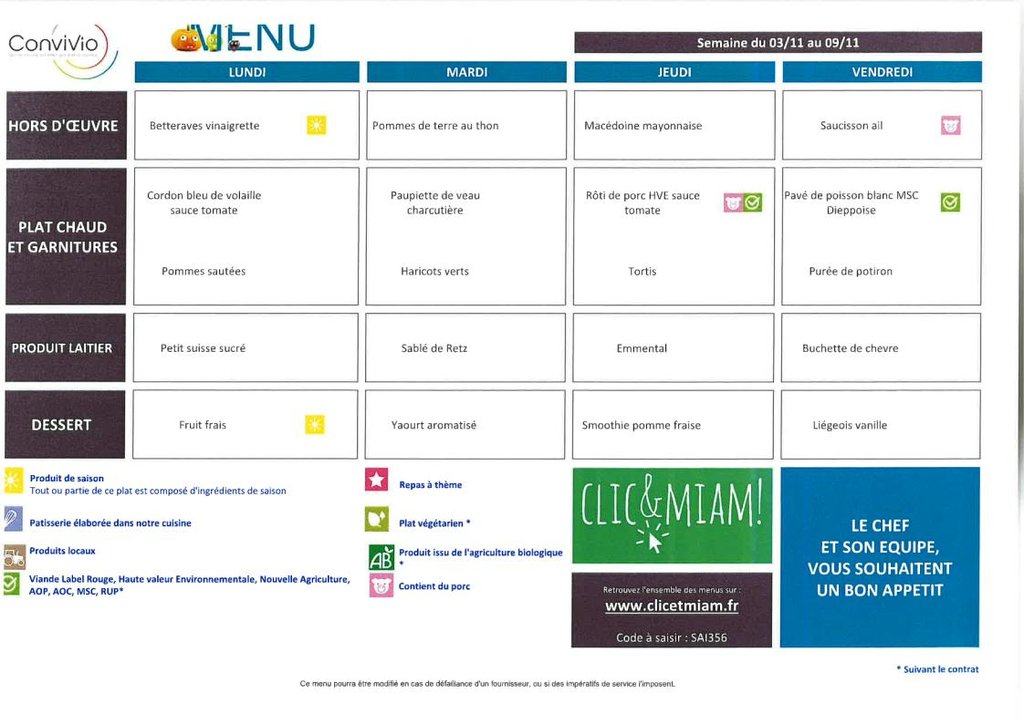 MENU DE LA CANTINE SCOLAIRE DE SAINS, SEMAINE 45 (DU 03 AU 09/11/2025)