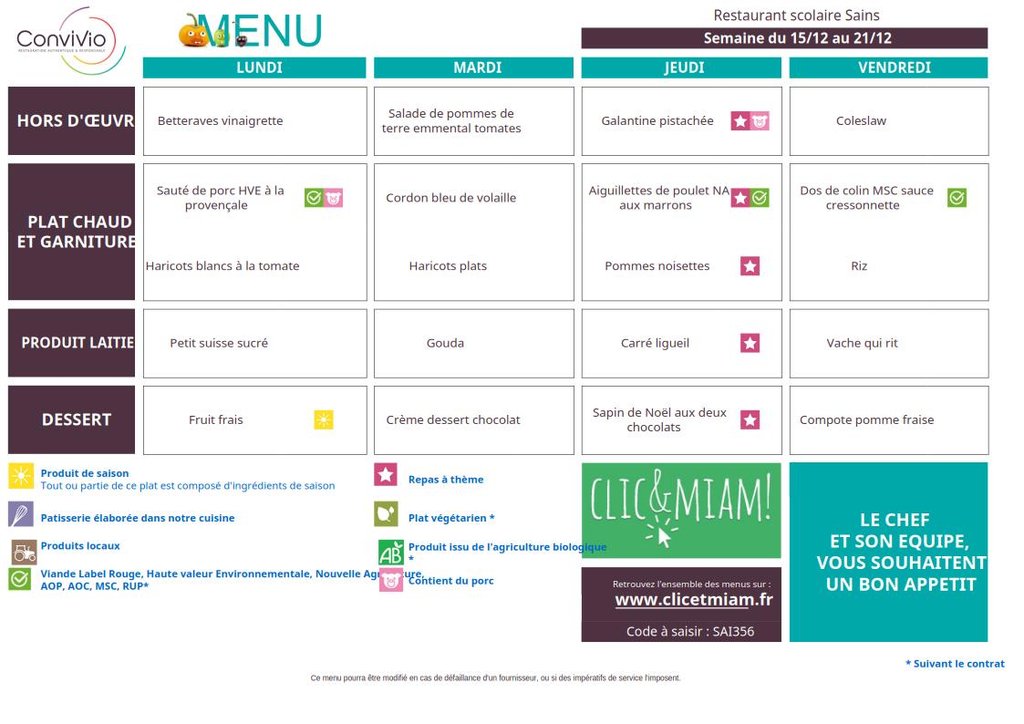 MENU DE LA CANTINE SCOLAIRE DE SAINS, SEMAINE 51 (DU 15 AU 21/12/2025)