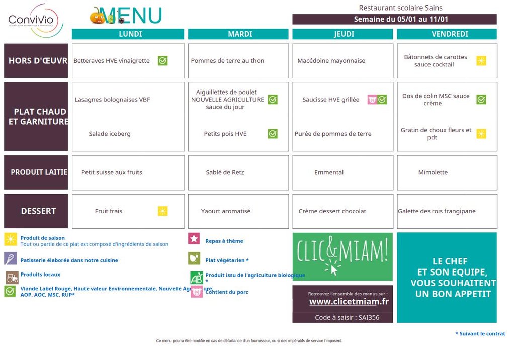 MENU DE LA CANTINE SCOLAIRE DE SAINS, SEMAINE 02 (DU 05 AU 11/01/2026)