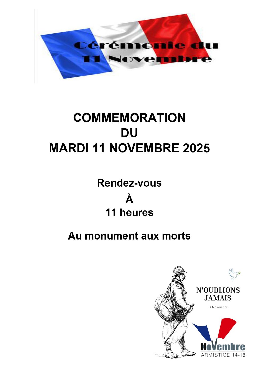 La cérémonie du 11 novembre aura lieu mardi 11 novembre à 11 heures au monument aux morts.