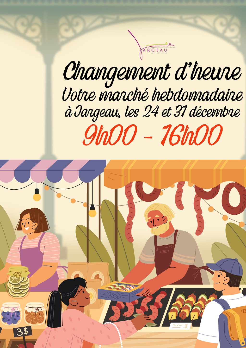 Changement des horaires du marché les mercredis 24 et 31 décembre. Votre marché passe à 9h00 - 16h00 lors des fêtes, vous pourrez retrouver tous vos commerçants alimentaires habituels sous la Halle !