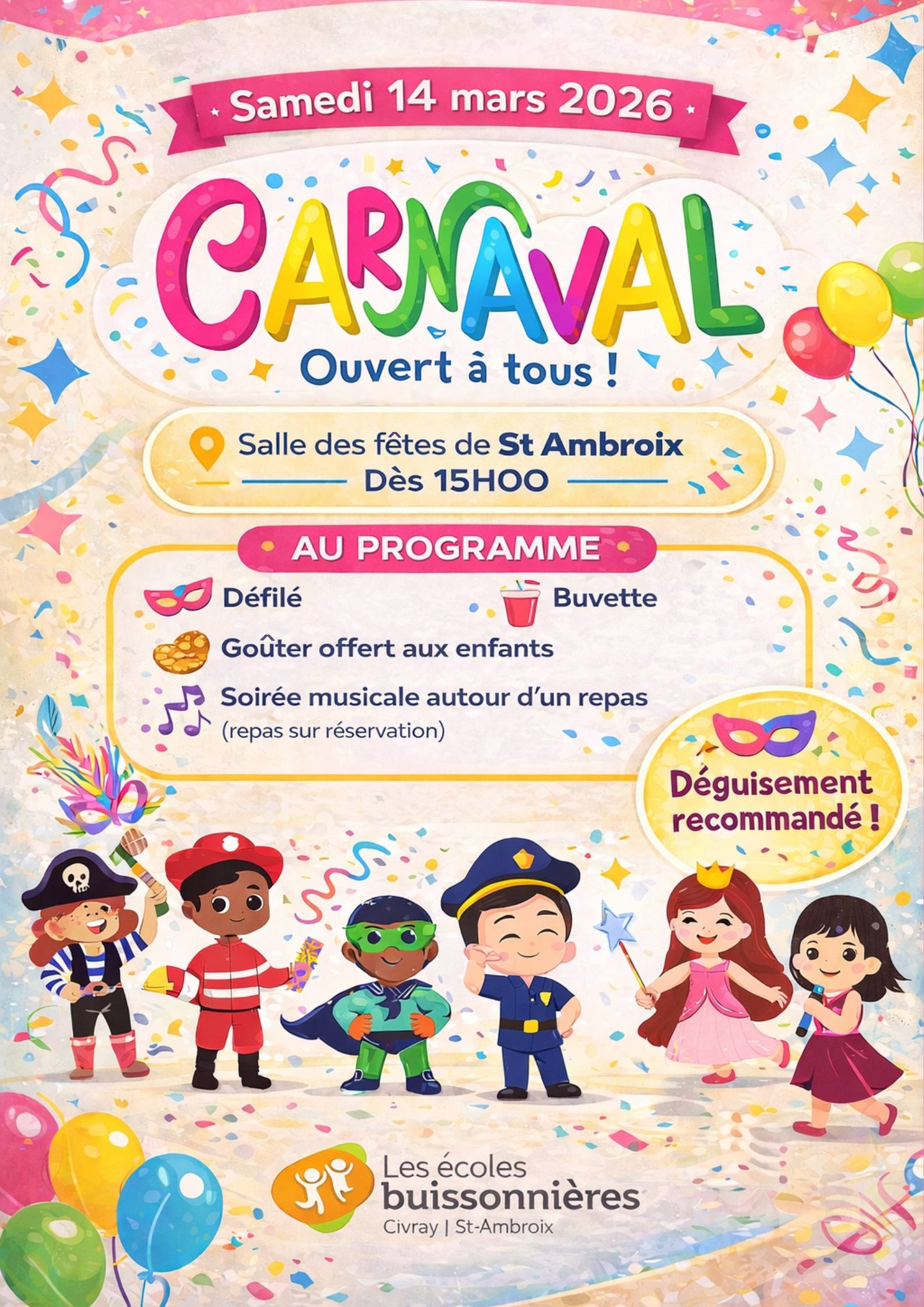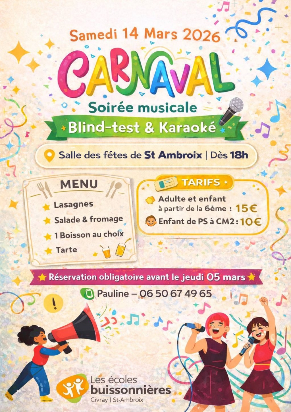 Nous vous attendons nombreux pour notre carnaval et pour notre soirée musicale, blind test et karaoké dès 18h