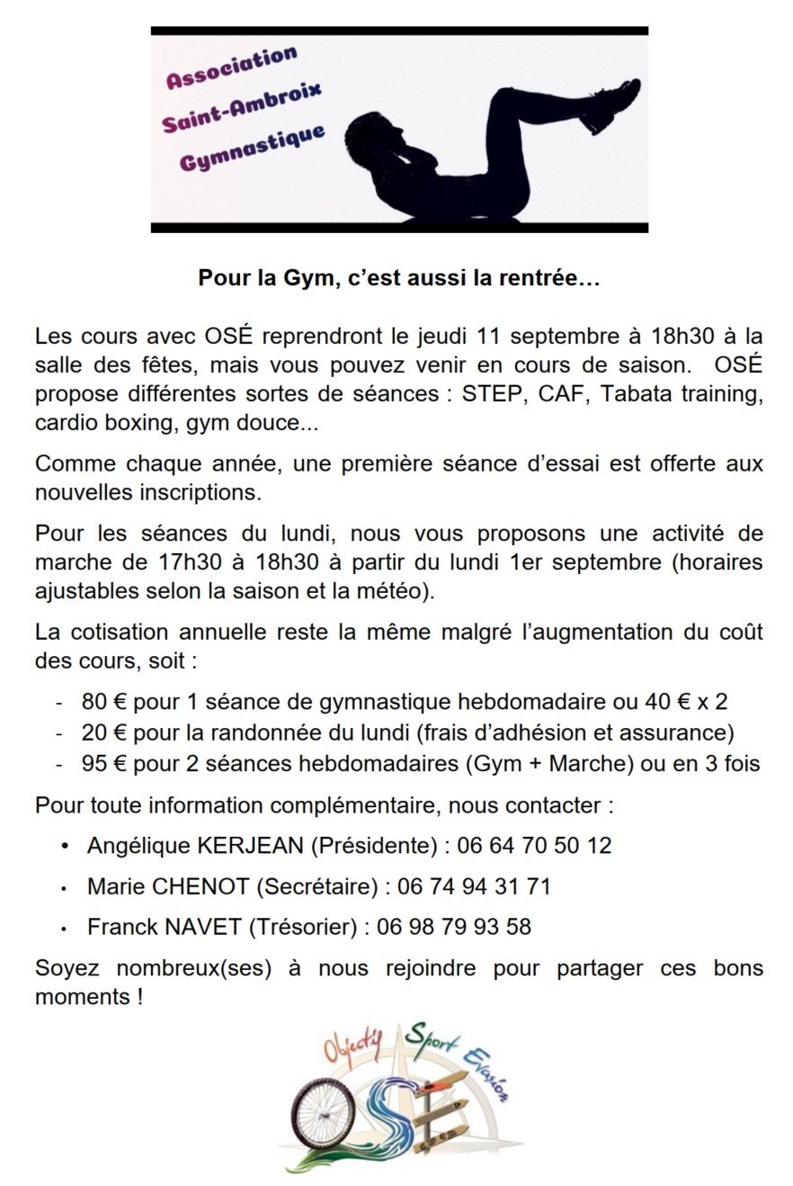 Les cours avec OSÉ reprendront le jeudi 11 septembre à 18h30 à la salle des fêtes, mais vous pouvez venir en cours de saison. OSÉ propose différentes sortes de séances : STEP, CAF, Tabata training, cardio boxing, gym douce...