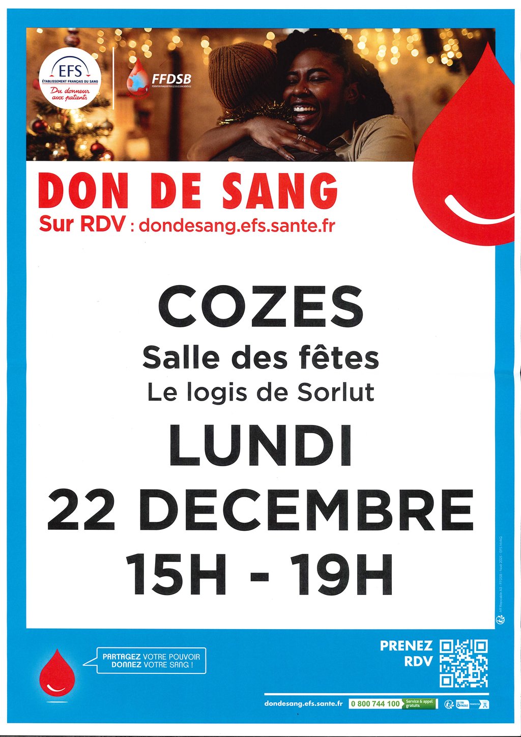 Le site de Saintes de l’Établissement Français du Sang Nouvelle Aquitaine organise un prochain Don du Sang le lundi 22 décembre 2025 à Cozes de 15h00 à 19h00. Pour tout renseignement, n’hésitez pas à les contacter au 05.46.93.53.44 ou prendre rdv sur dondesang.efs.sante.fr