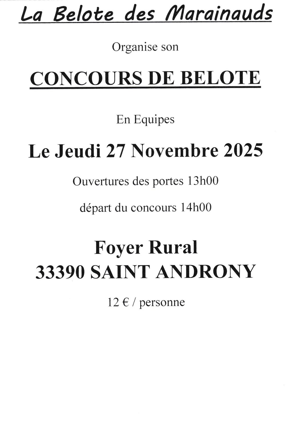 Concours de belote le jeudi 27 novembre à la salle du foyer rural.