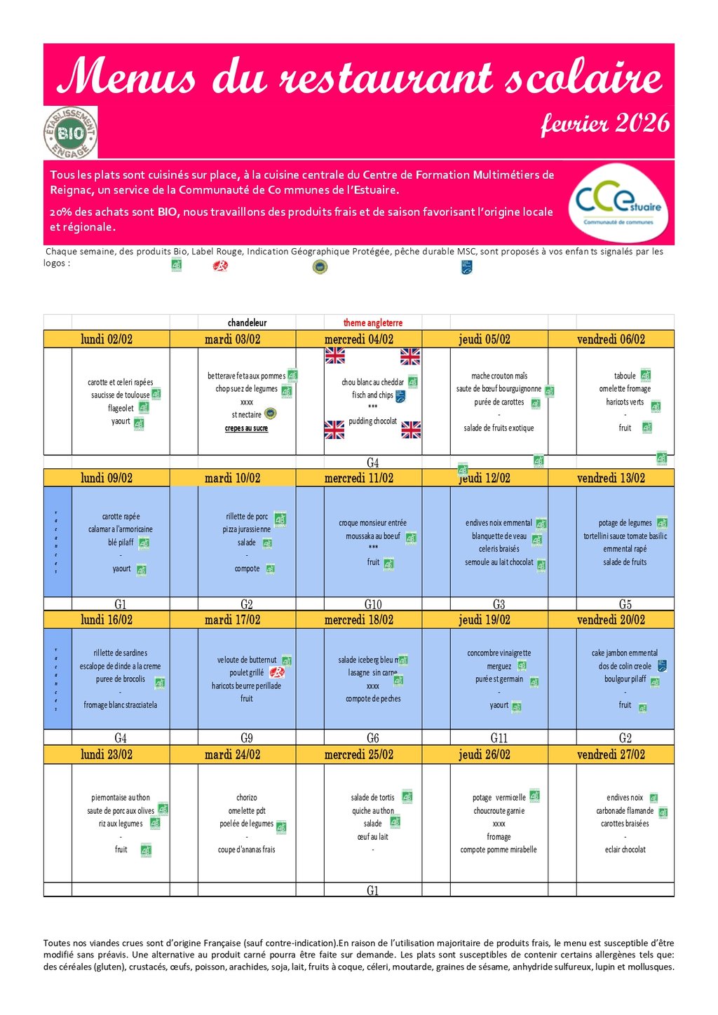 Menu du restaurant scolaire d'ANGLADE pour février 2026 (pour les parents des enfants de St-Androny scolarisés sur Anglade).