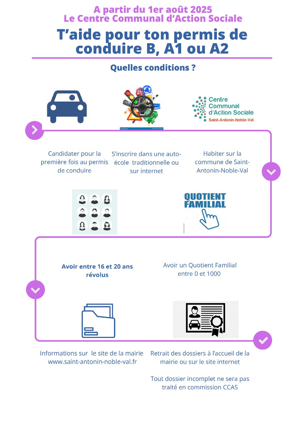 Depuis cet été, le CCAS propose une aide financière pour tous les jeunes Saint-Antoninois inscrits pour la première fois à l’examen du permis de conduire B, A1 ou A2, âgés de 16 à 20 ans révolus, sous condition de ressources (QF entre 0-1000).