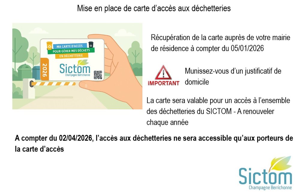 Afin de pouvoir récupérer votre carte d'accès à la déchetterie, veuillez vous rendre en Mairie avec un justificatif de domicile.