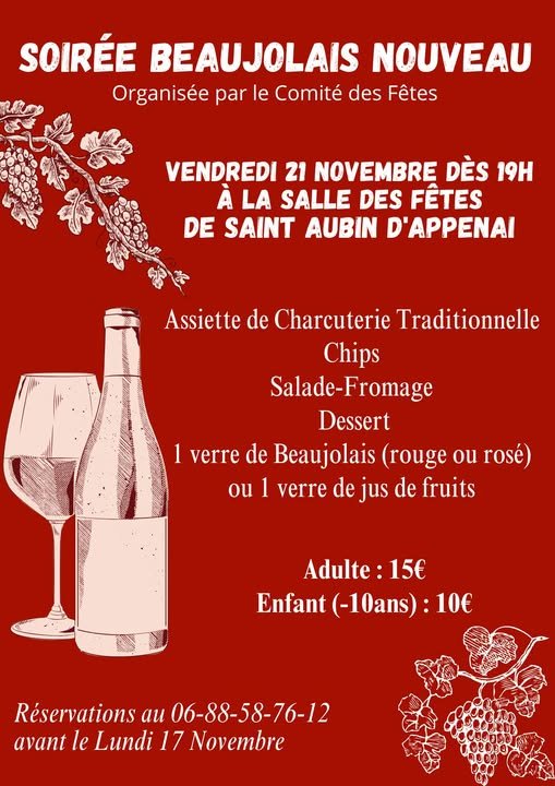 Soirée Beaujolais organisée par le comité de fêtes de Saint Aubin d'Appenai à la salle des fêtes à partir de 19h