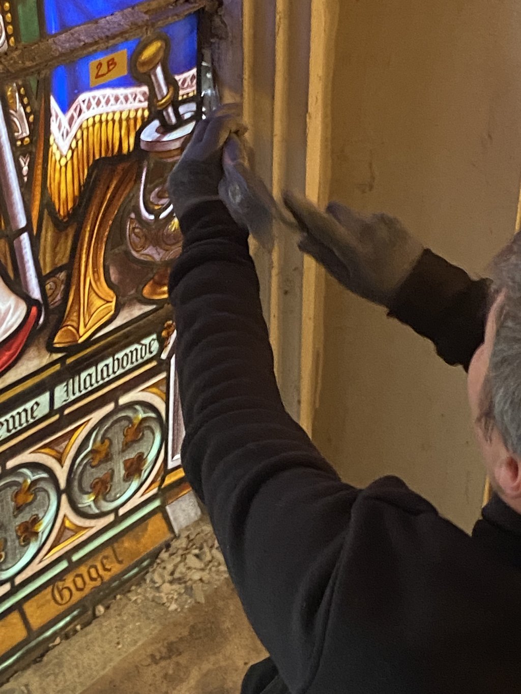 Gwendoline GUILLOU, vitrailliste, maître verrier , meilleur ouvrier de France en 2015 et Marion CATTANI ,maître verrier, sont venues le démonter, pièce par pièce. Un devis de restauration va nous être envoyé.