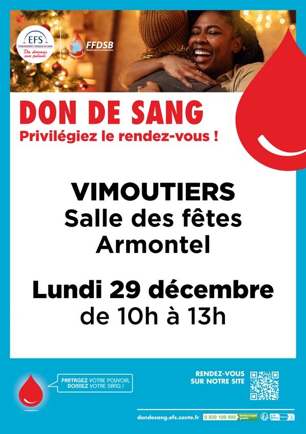 Retrouvez-nous Lundi 29 Décembre de 10h à 13h à la Salle des Fêtes Armontel de VIMOUTIERS - Organisez votre venue en vous rendant sur notre site F https://efs.link/kaKzh