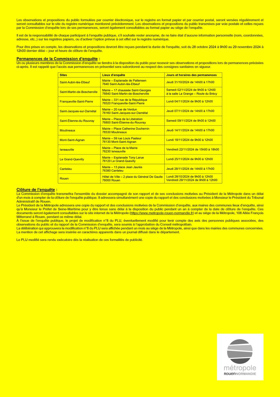 - dans les mairies désignées comme les 11 lieux d’enquête, aux jours et heures d’ouverture habituels : mairies de Saint-Aubin-lès-Elbeuf, Saint-Martin-de-Boscherville, Franqueville-Saint-Pierre, Saint-Jacques-sur-Darnétal, Saint-Étienne-du-Rouvray, Moulineaux, Mont-Saint-Aignan, Isneauville, Le Grand-Quevilly, Canteleu, Rouen.