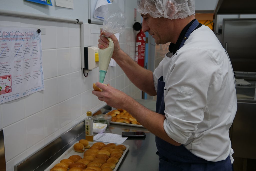 Pour le repas servi ce midi, les Ă©quipes ont prĂ©parĂ© un menu festif fait maison, Ă partir de produits en circuit court cuisinĂ©s sur place : navette au surimi, sot-lây-laisse de dinde et sa sauce au pain dâĂ©pices, grenailles rĂŽties, puis une bĂ»che "chocahuĂšte" pour conclure avec gourmandise đ