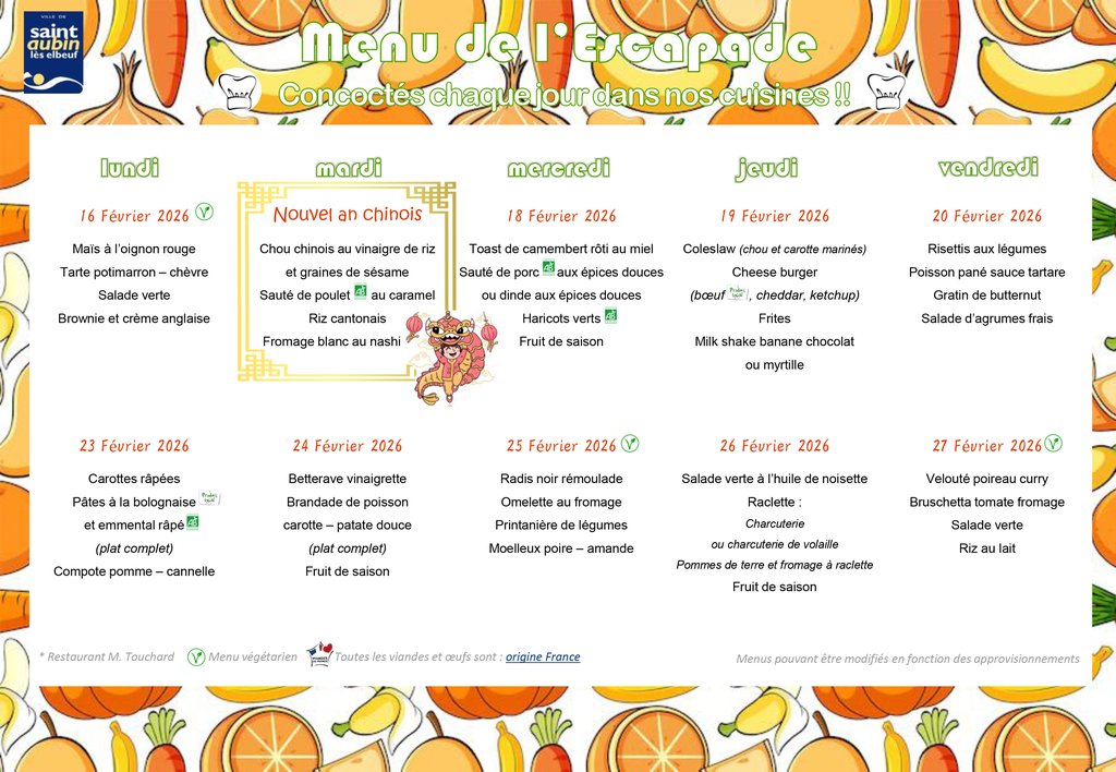 Les menus du mois de février sont disponibles ! Des repas équilibrés, variés et préparés chaque jour dans nos cuisines, à découvrir ci-dessous. À ne pas manquer : un menu spécial Nouvel An chinois le mardi 17 février ! 🎉