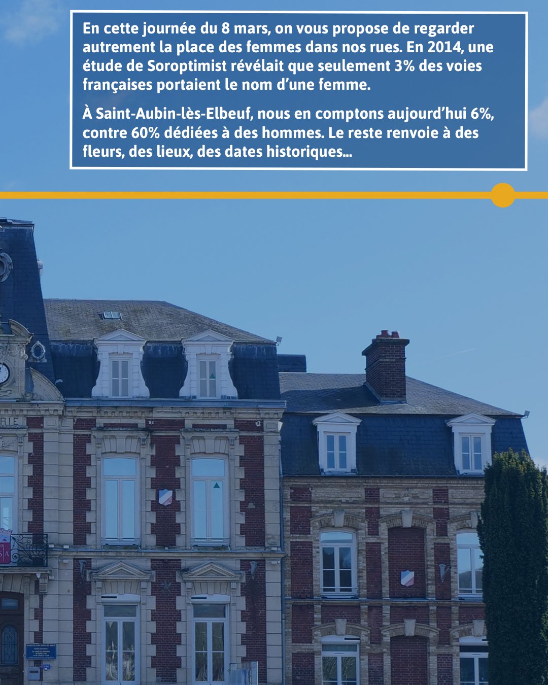 En France, les voies rendent majoritairement hommage à des hommes : en 2014, une étude nationale indiquait que seulement 3% d’entre elles portaient un nom féminin. À Saint‑Aubin‑lès‑Elbeuf, ce chiffre atteint aujourd’hui 6 %, un chiffre en progression sur les 10 dernières années.