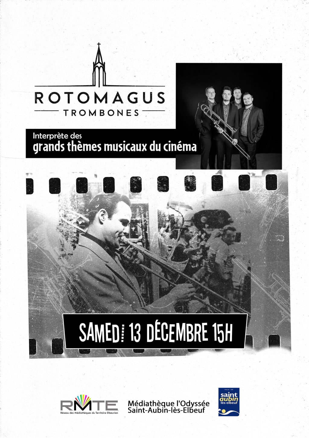 Rotomagus Trombones ce sont quatre virtuoses, Gaëtan Baert, Martin Couvez, Romain Malhouitre et Anthonin Tabesse, qui se sont rencontrés en 2012 au Conservatoire de Rouen. Quatre passionnés qui font désormais briller le trombone en cassant les frontières musicales et interprèteront quelques-unes des plus grandes musiques de films.