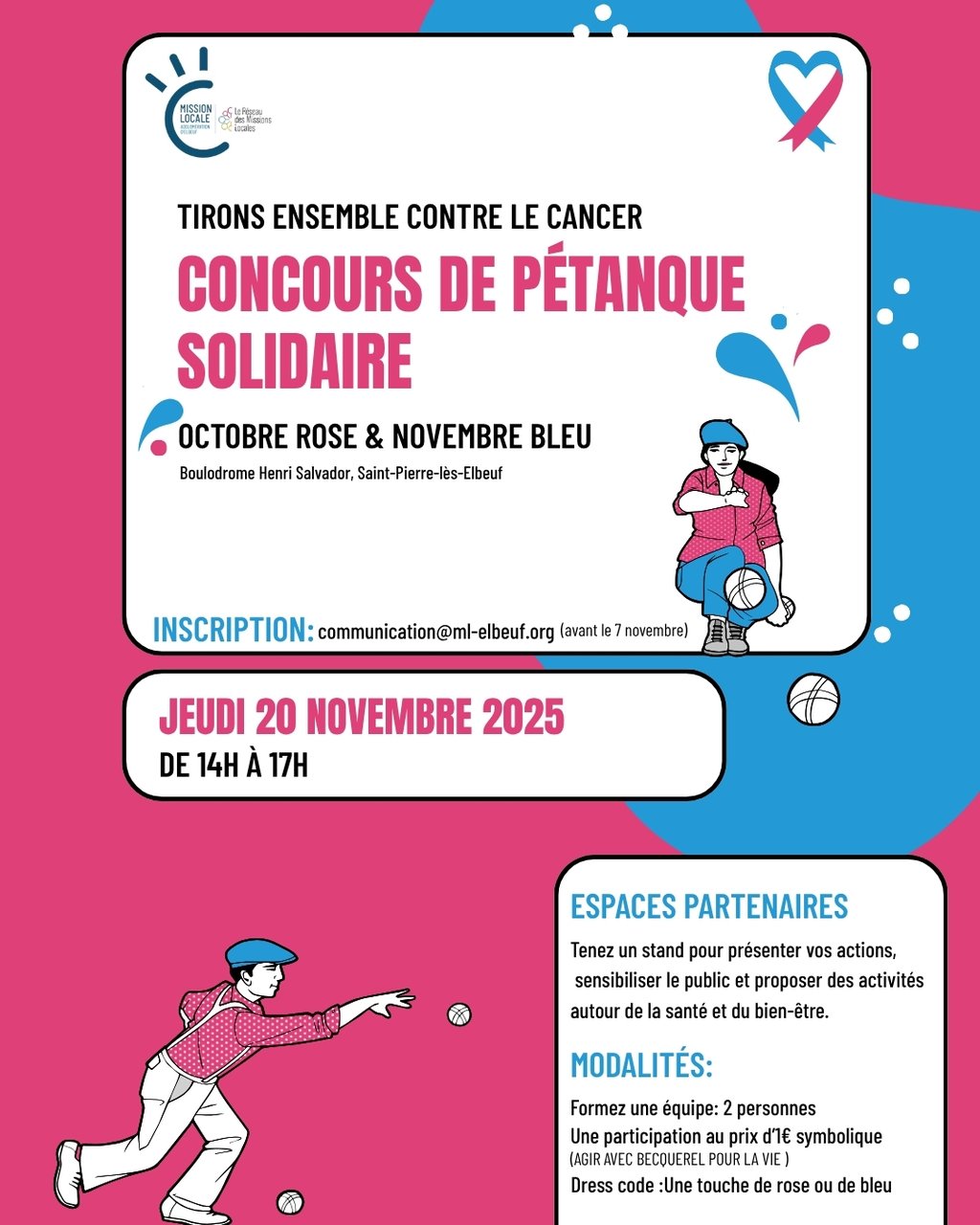 La Mission Locale de l’Agglomération Elbeuvienne organise un concours de pétanque solidaire dans le cadre d’Octobre Rose et Novembre Bleu. Cet événement convivial et engagé a pour objectif de sensibiliser à la santé et au bien-être tout en soutenant la lutte contre le cancer.
