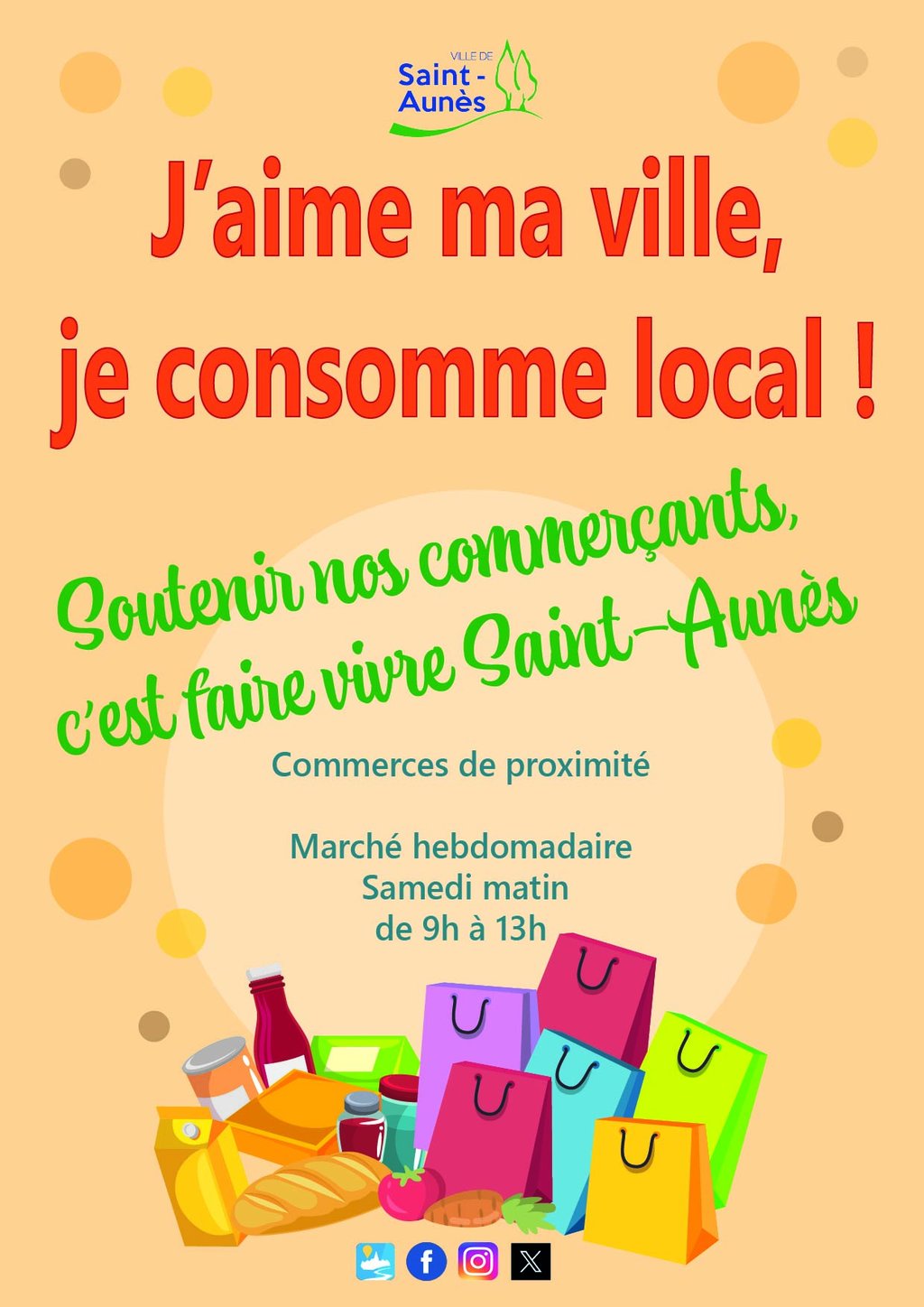 Consommons local : soutenons nos commerces de proximité et notre marché du samedi matin de 9h à 13h au centre ville de Saint-Aunès.