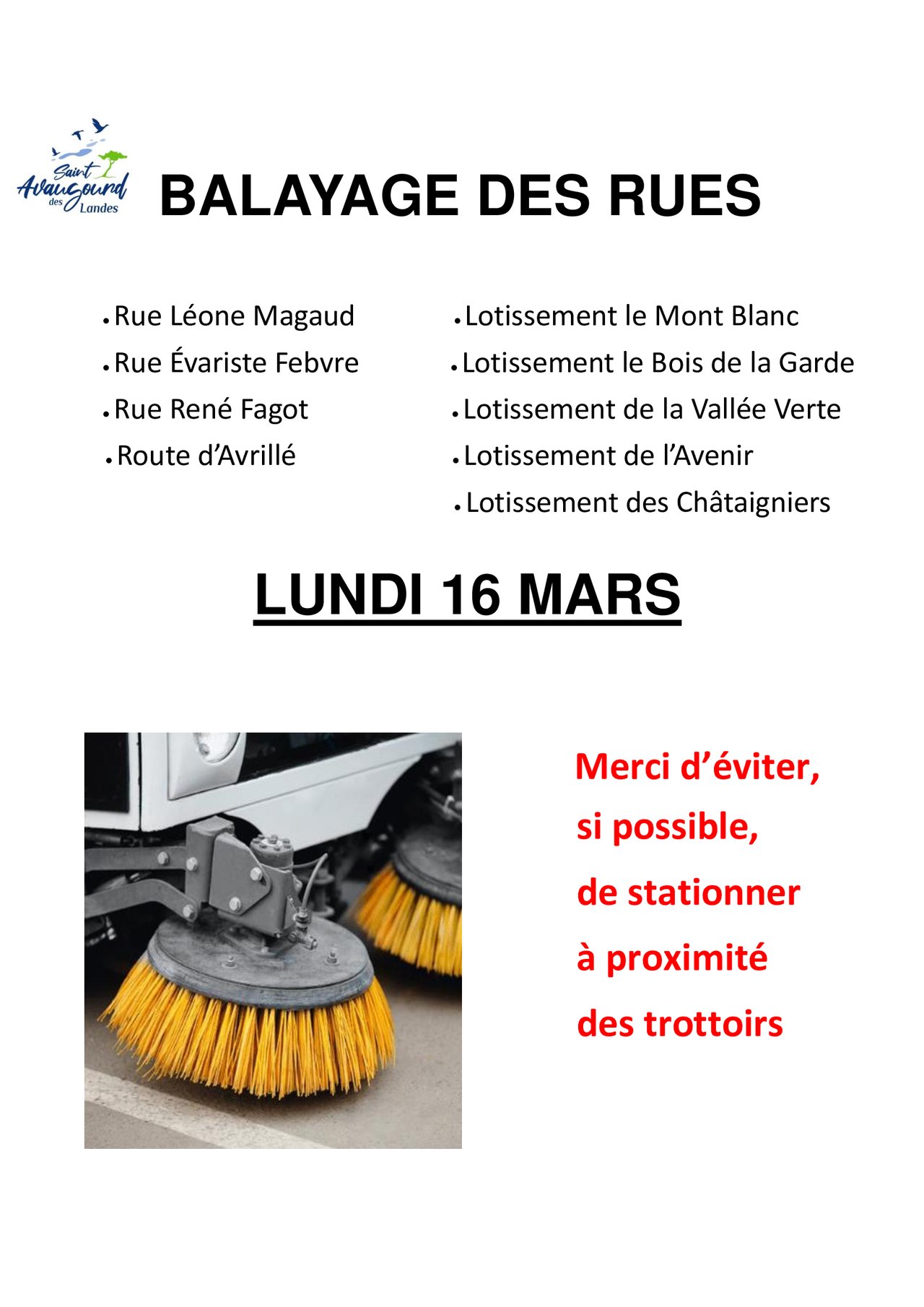 Balayage des rues et lotissements le lundi 16 mars.