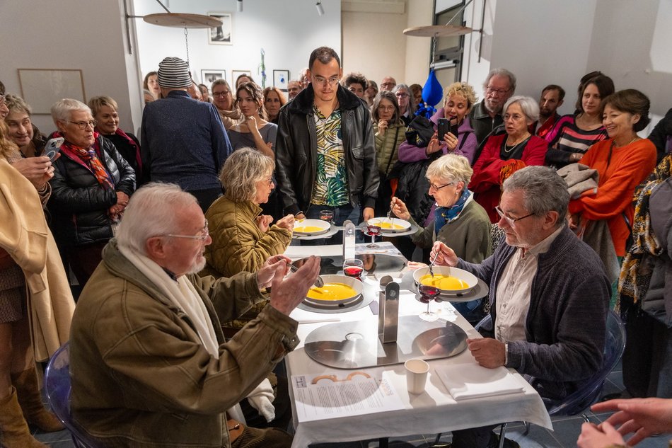 Une des œuvres de l’exposition a d’ailleurs été mise en scène lors de ce vernissage autour d’un repas très particulier où se mêlent l’équilibre, le partage et la synchronisation avec son partenaire.