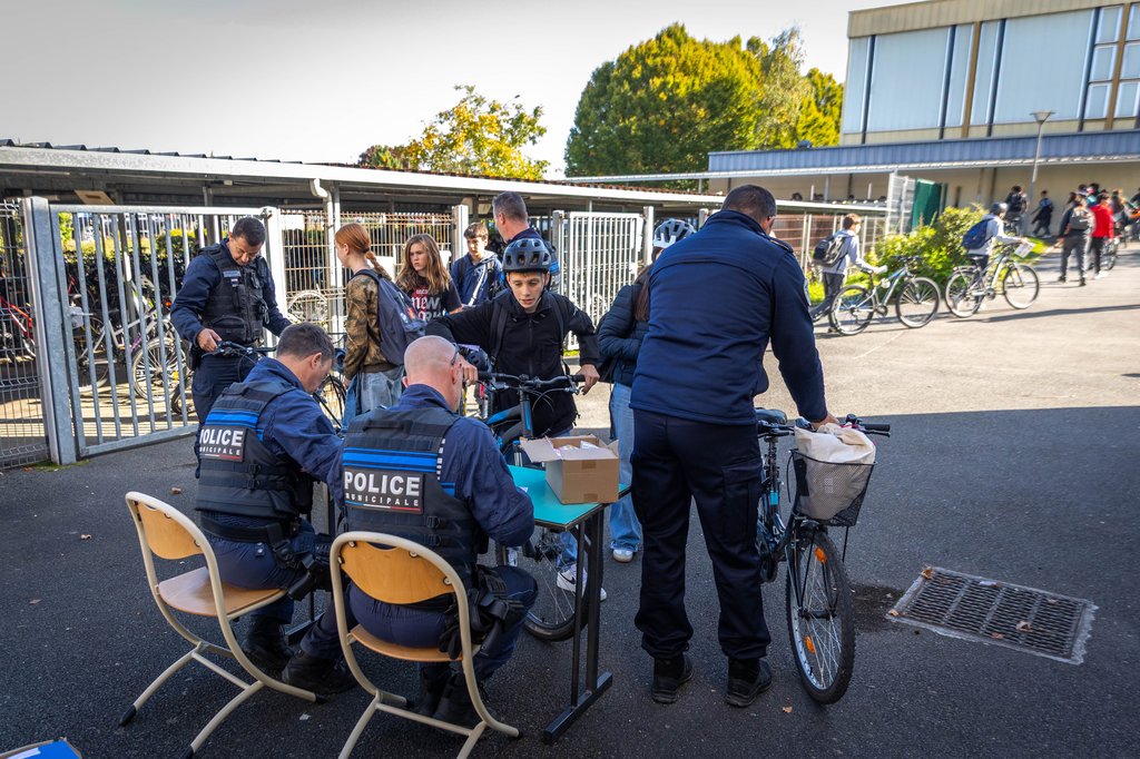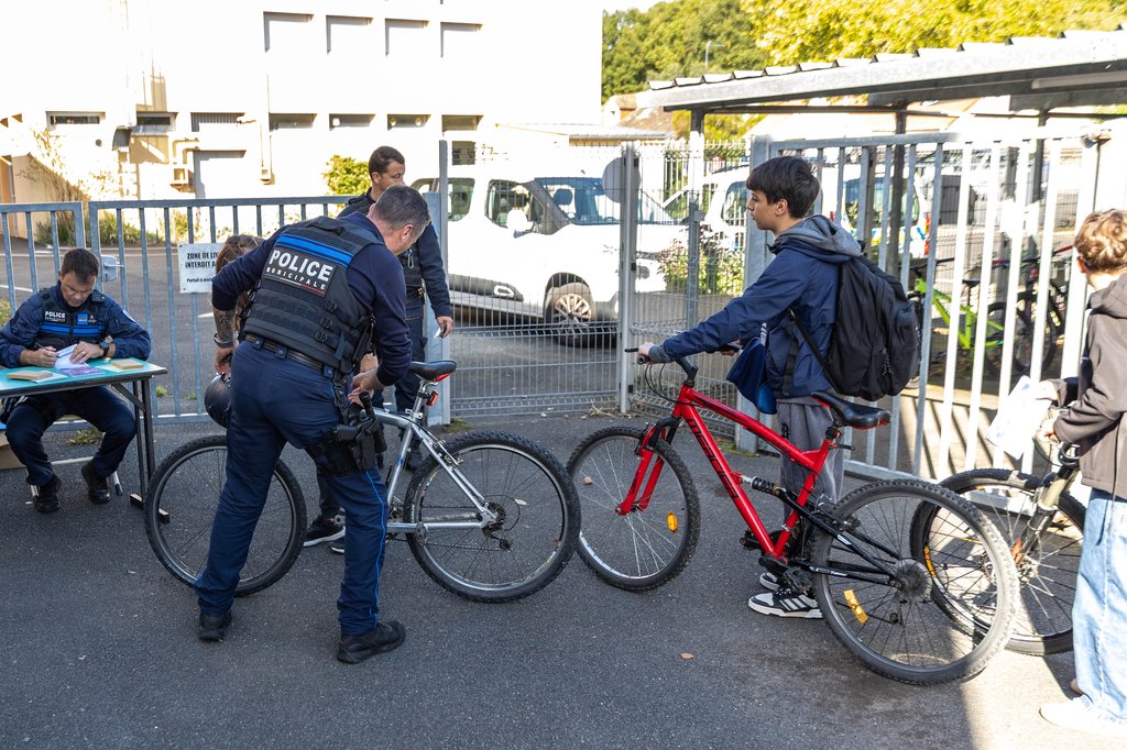 Depuis début octobre, des agents de la police municipale, accompagnés par la police nationale, se rendent au collège Jules Romains pour vérifier le bon état des vélos des élèves de toutes les classes : état des freins, des lumières, des pneus, utilisation du casque.