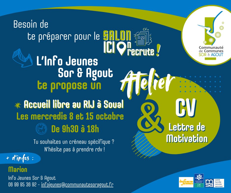 ATELIER CV & LETTRE DE MOTIVATION : les mercredis 8 et 15 octobre de 9h30 à 18h