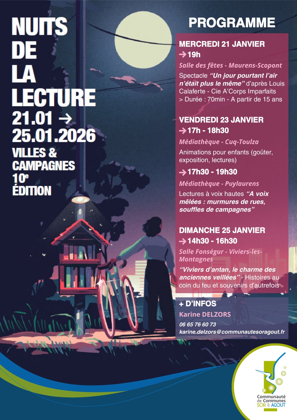 Grâce à la participation du réseau des médiathèques, des municipalités de Viviers-Lès-Montagnes, de Puylaurens, et de la Communauté de Communes Sor & Agout vous aurez l’opportunité de parcourir notre territoire pour savourer ces Nuits de la lecture 2026 !