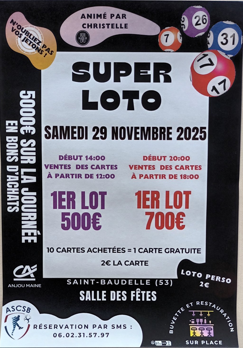 L'as Contest St Baudelle foot organise 2 loto samedi 29 novembre.