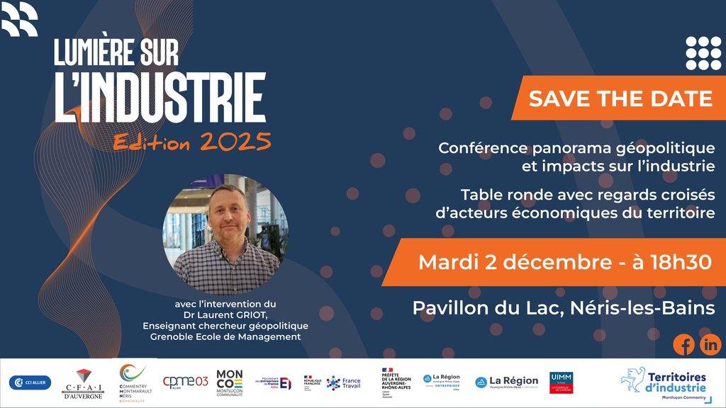 Mardi à 18h30, la salle du Pavillon du Lac à Néris-les-Bains, accueillera une conférence sur le panorama géopolitique et ses impacts sur l’industrie, animée par le Dr Laurent Griot, enseignant-chercheur en géopolitique à Grenoble École de Management.