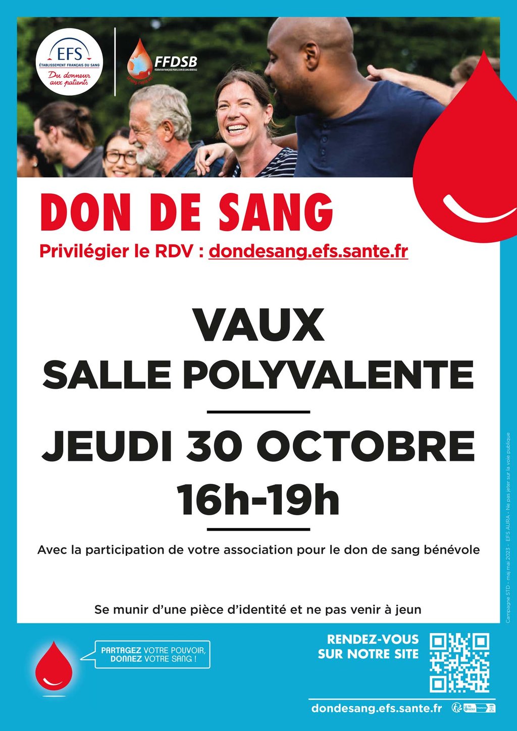 L'Amicale des Donneurs de Sang Bénévoles d'Estivareilles organise avec l'EFS une collecte don du sang le jeudi 30 octobre de 16 h à 19 h à la salle polyvalente de Les Trillers à Vaux.