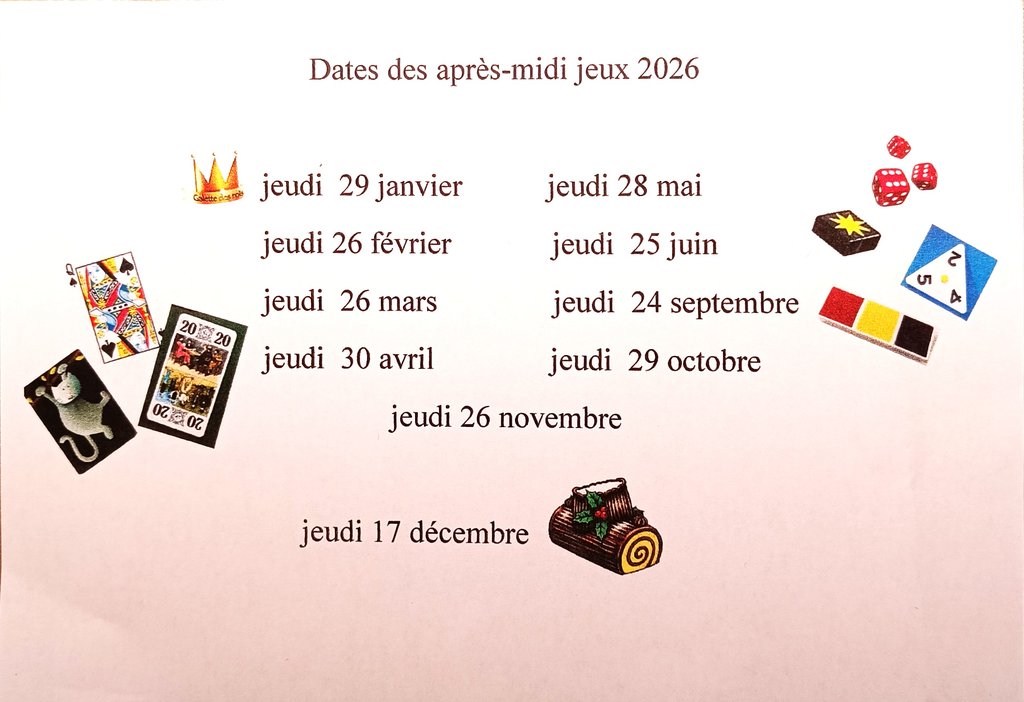 Dates des après-midis : 29 janvier, 26 février, 26 mars,30 avril, 28 mai, 25 juin, 24 septembre, 29 octobre, 26 novembre, 17 décembre