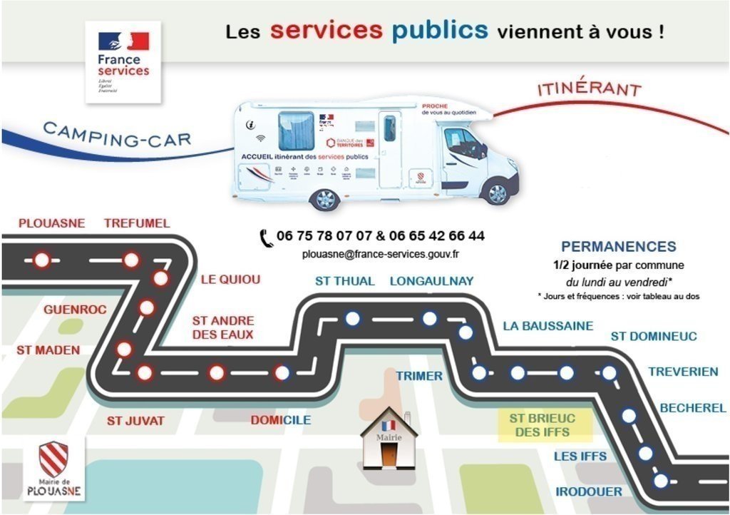 1/ La commune de Saint Brieuc des Iffs s'associe à France Services Itinérant de Plouasne afin de proposer aux habitants du territoire un accompagnement dans diverses démarches administratives, un point d'information et d'orientation, une mise à disposition d'outils informatiques et d'aide à l'utilisation.