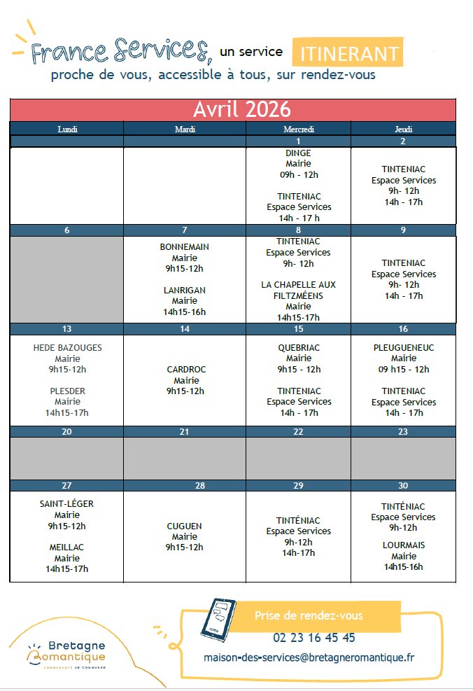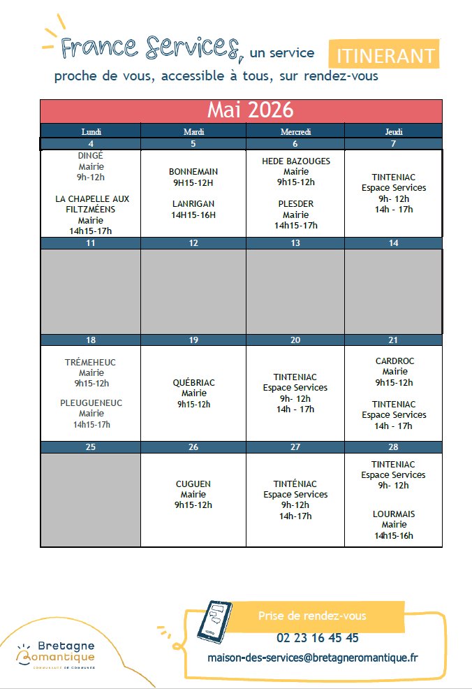 - Une ligne est proposée pour joindre France Services Itinérant de Bretagne romantique : 02 23 16 45 45