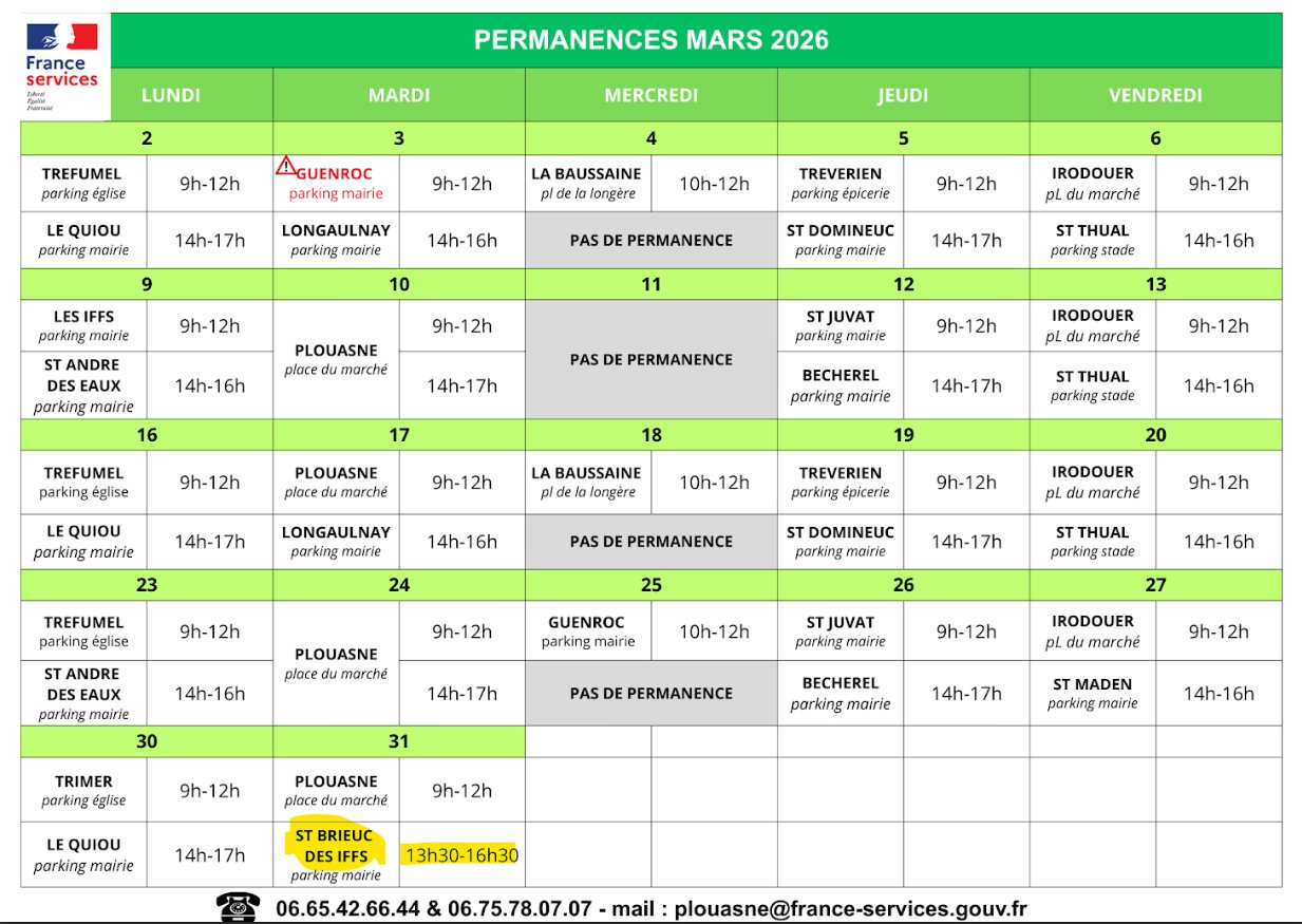 PERMANENCE FRANCE SERVICES À SAINT BRIEUC DES IFFS LE 31 MARS