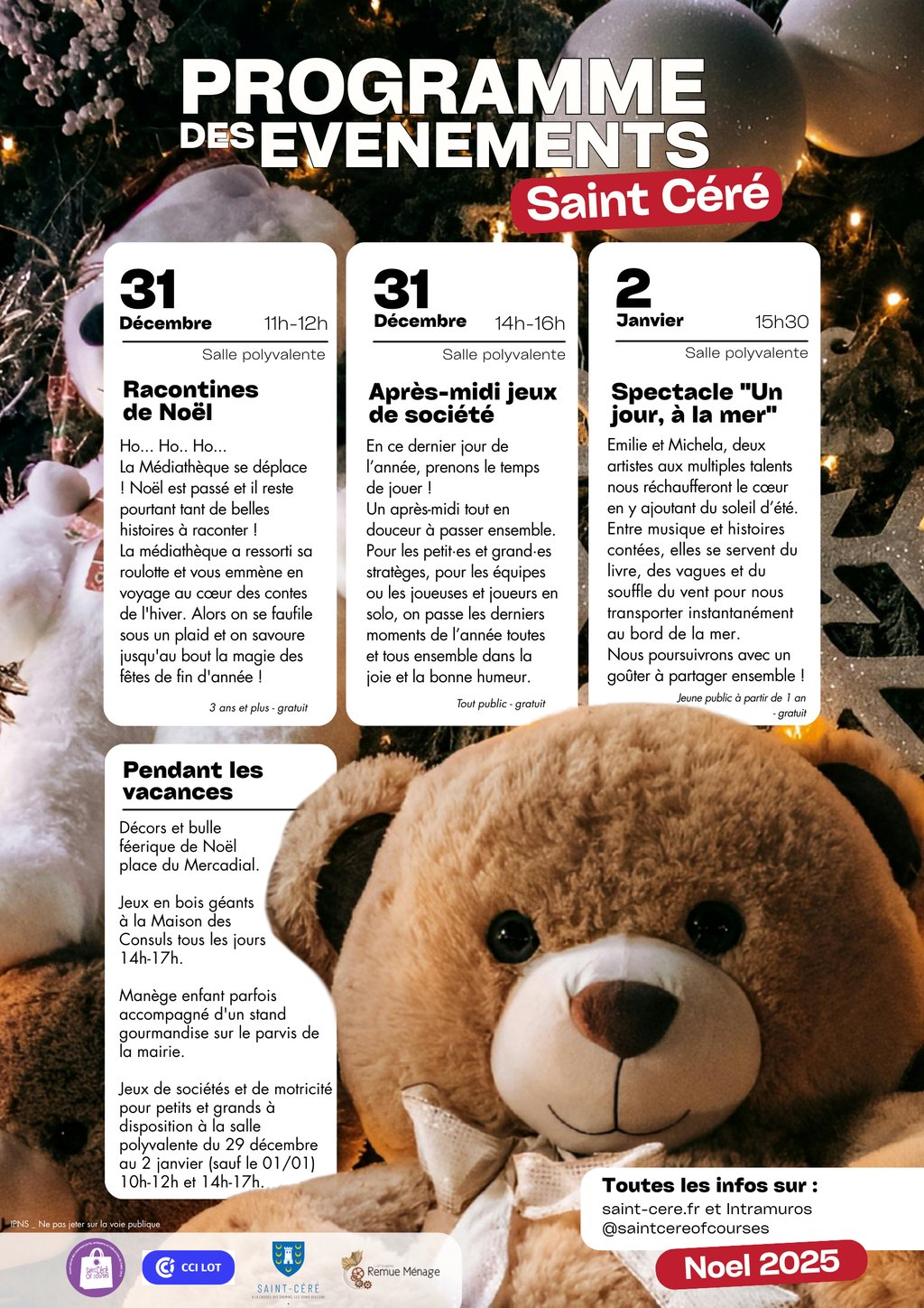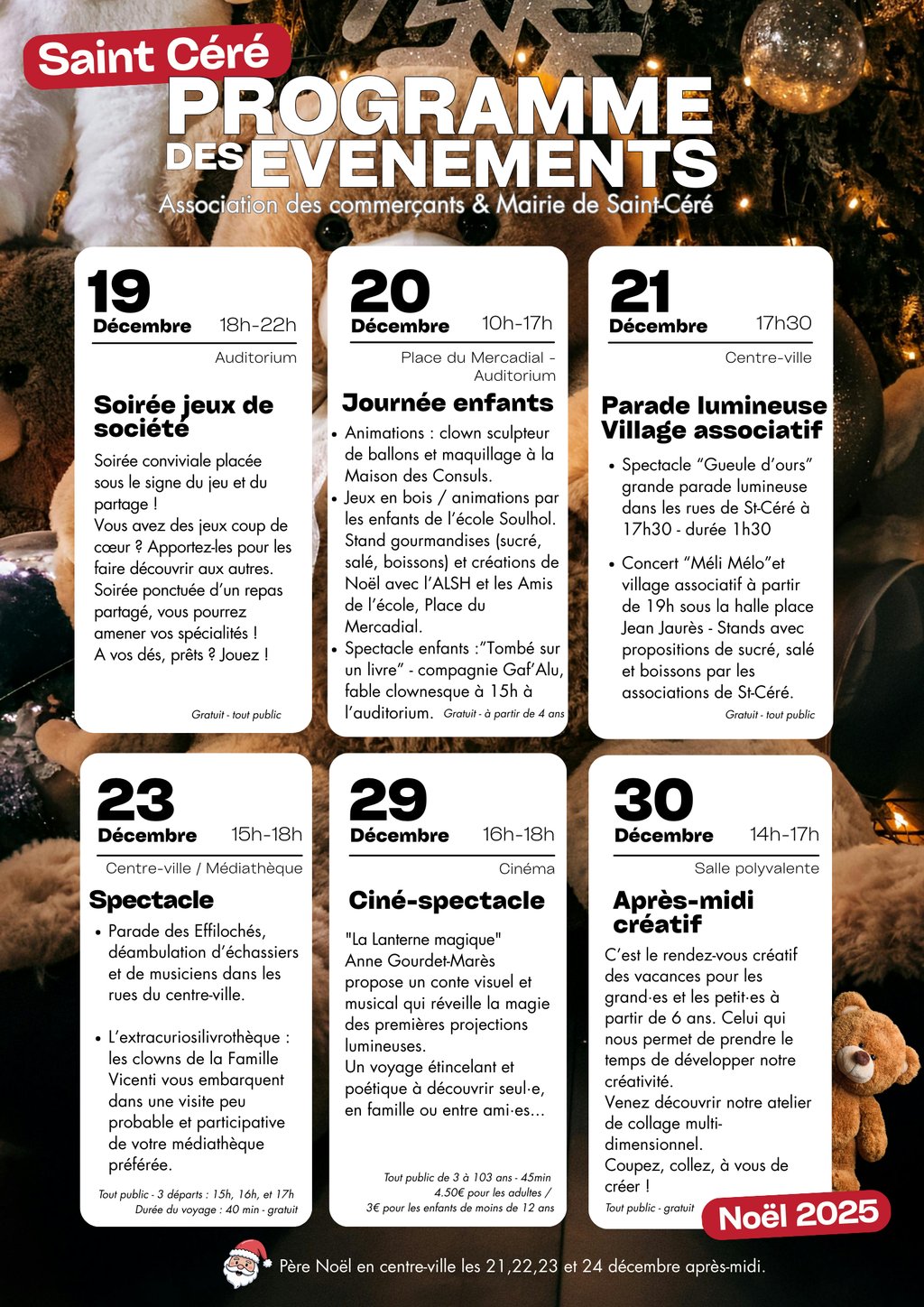 L’Association des commerçants et la mairie de Saint-Céré vous invitent à découvrir le programme des animations de Noël 2025.