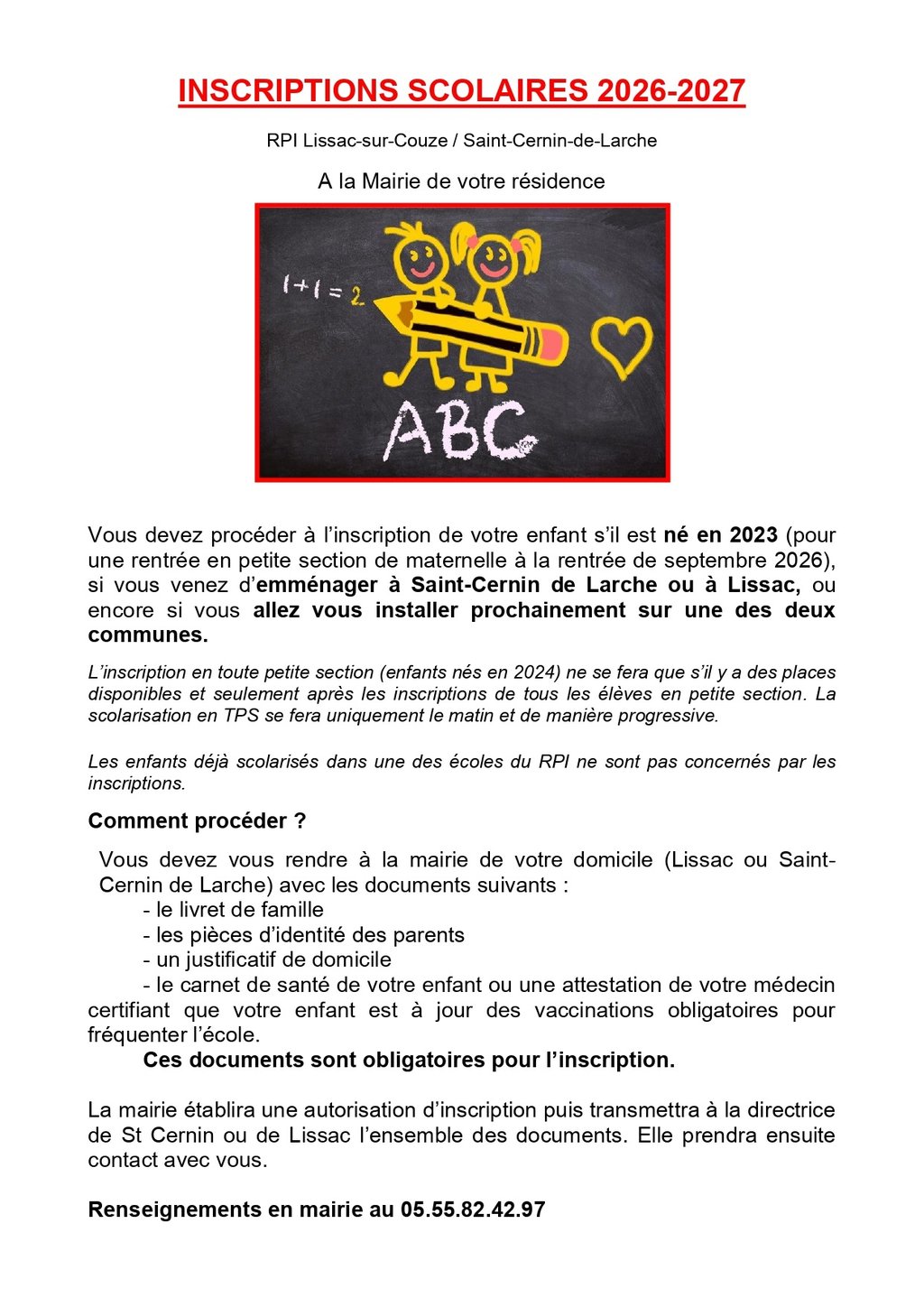 INSCRIPTIONS SCOLAIRES RENTREE 2026/2027