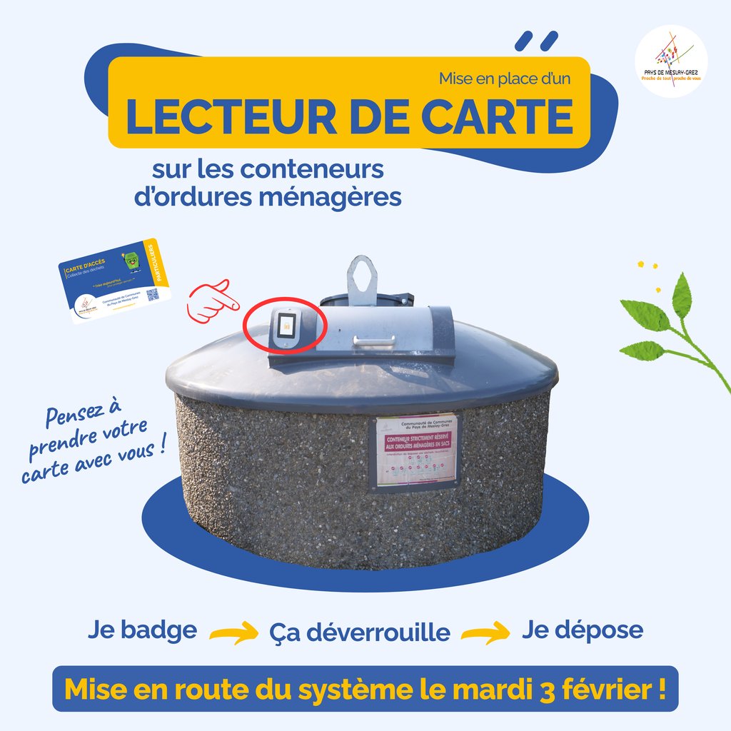 Dans le cadre de l’amélioration continue du service de gestion des déchets, la Communauté de communes du Pays de Meslay-Grez met en place un système de contrôle d’accès par carte sur les conteneurs d’ordures ménagères du territoire.