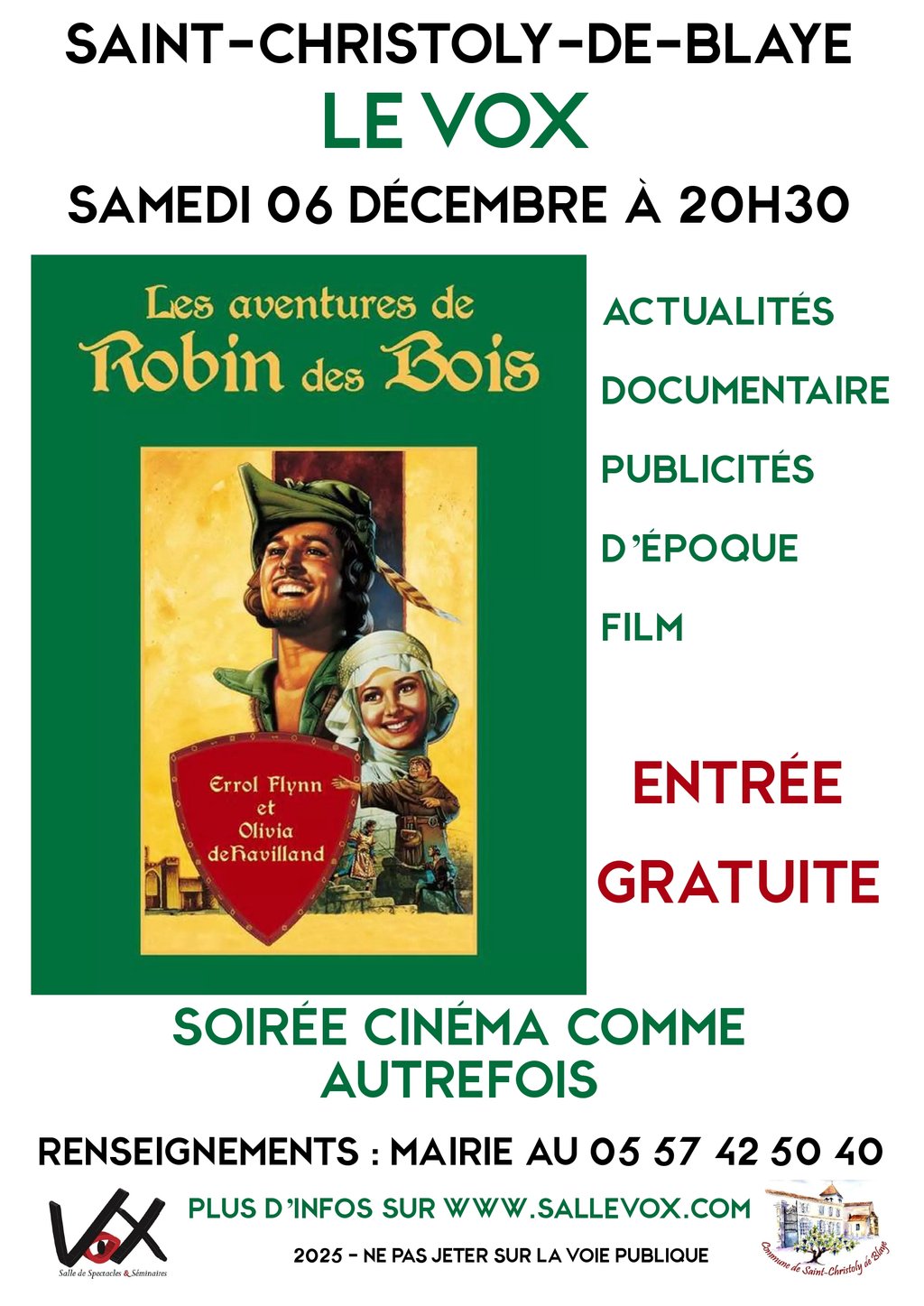 Actualités, documentaire et publicités d'époque puis diffusion du film Robin des bois avec Errol Flynn.