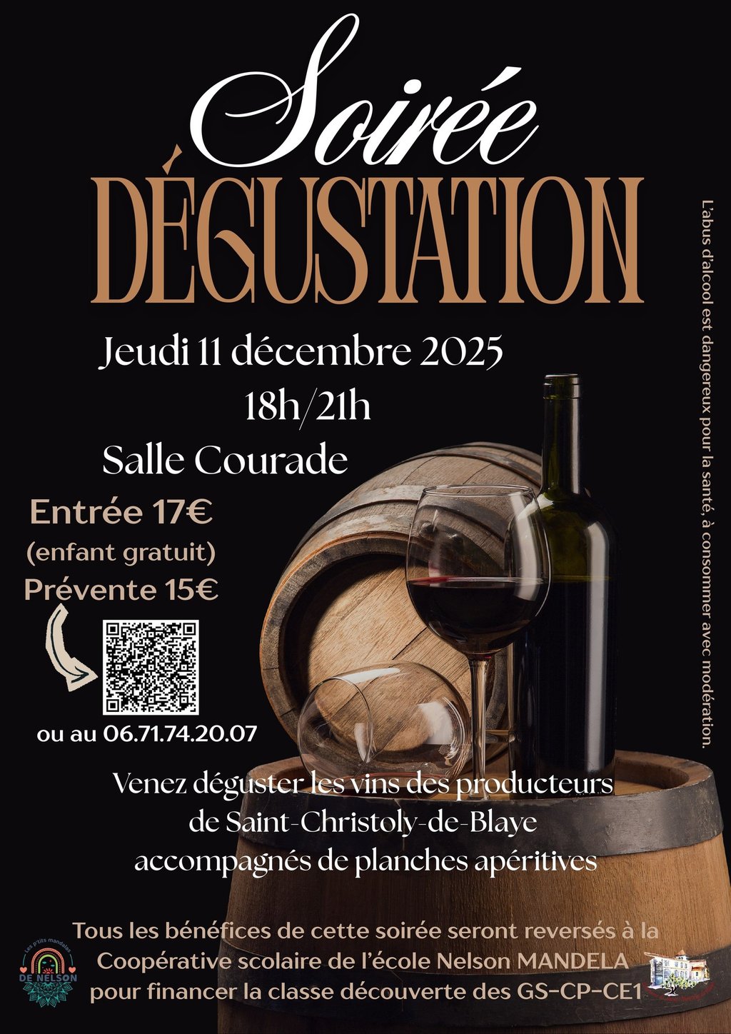 Soirée "Dégustation de vins" de producteurs de la commune avec planches apéritives organisée par l'APE Les P'tits Mandalas de Nelson au profit de l'école pour aider au financement d'une classe découverte.