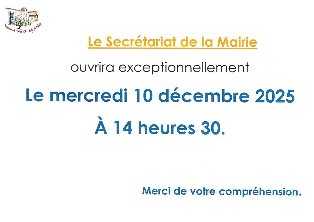 SECRETARIAT DE LA MAIRIE "LE 10 DÉCEMBRE OUVERTURE À 14H30"