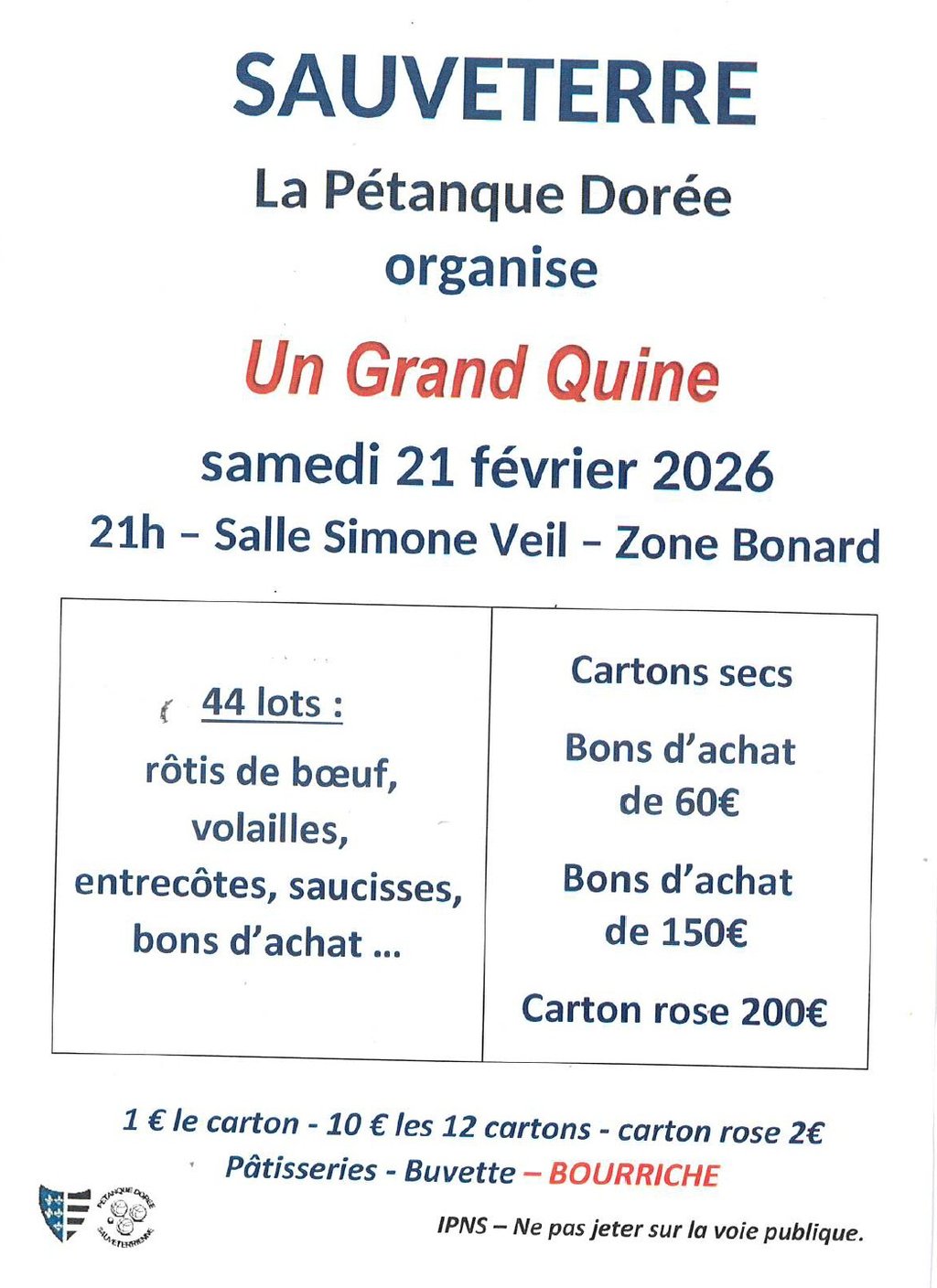 La Pétanque Dorée Sauveterrienne, en partenariat avec la Commune de Sauveterre-de-Guyenne, vous donne rendez-vous samedi 21 février 2026 à 21 h, à la salle Simone Veil.