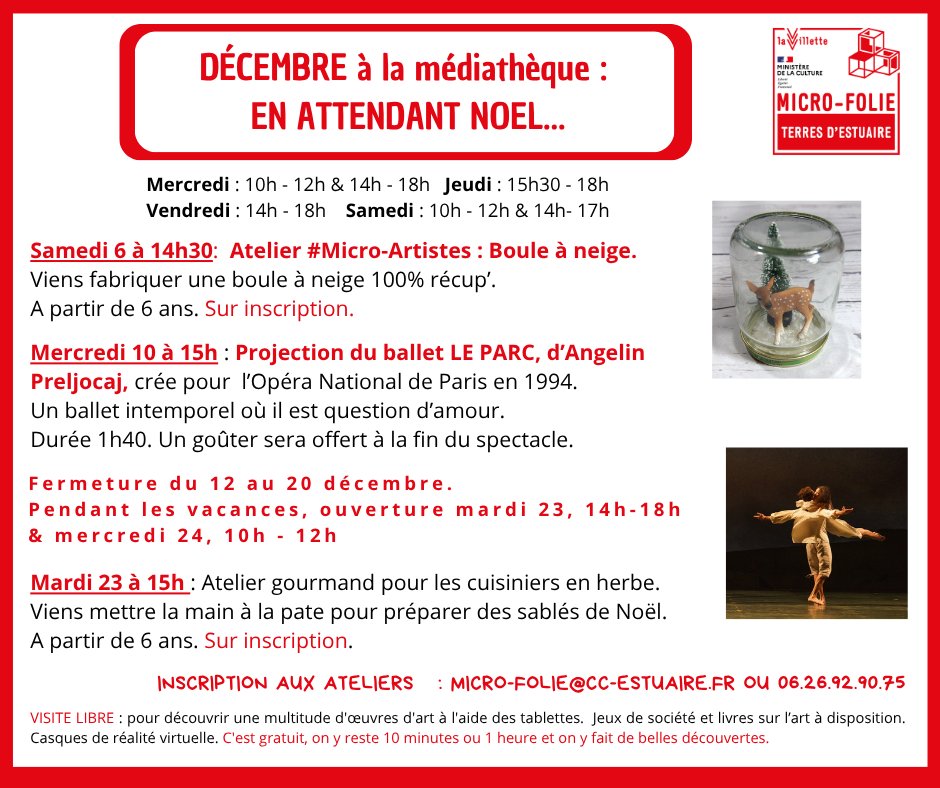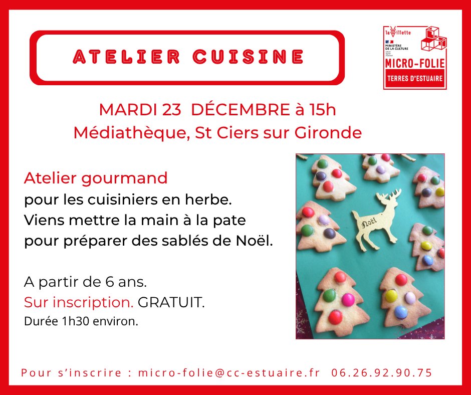 Mardi 23 à 15h : Atelier gourmand pour les cuisiniers en herbe. Viens mettre la main à la pate pour préparer des sablés de Noël. A partir de 6 ans. Sur inscription.