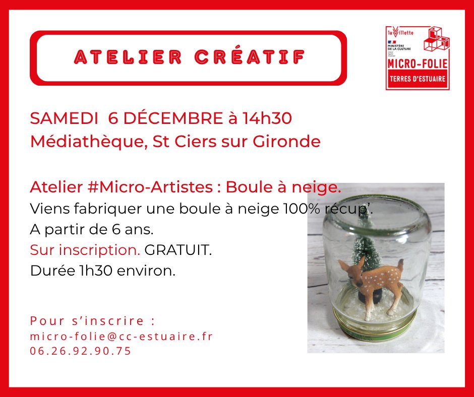 Samedi 6 à 14h30 : Atelier #Micro-Artistes : Boule à neige. Viens fabriquer une boule à neige 100% récup’. A partir de 6 ans. Sur inscription.