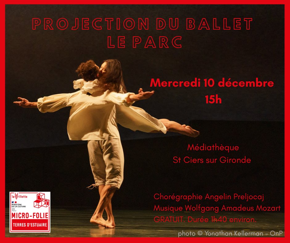 Mercredi 10 à 15h : Projection du ballet LE PARC, d’Angelin Preljocaj, crée pour l’Opéra National de Paris en 1994. Un ballet intemporel où il est question d’amour. Durée 1h40. Un goûter sera offert à la fin du spectacle.