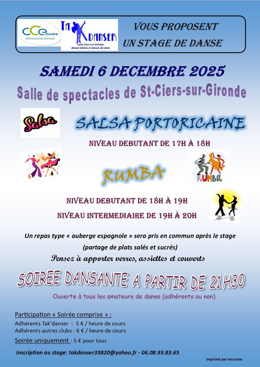 L'association Tak'danser propose un stage de Salsa portoricaine et de Rumba, samedi 6 décembre 2025, à la salle de spectacles de Saint-Ciers-sur-Gironde, ouvert à tout public, licencié ou non à un club de danses de salon.