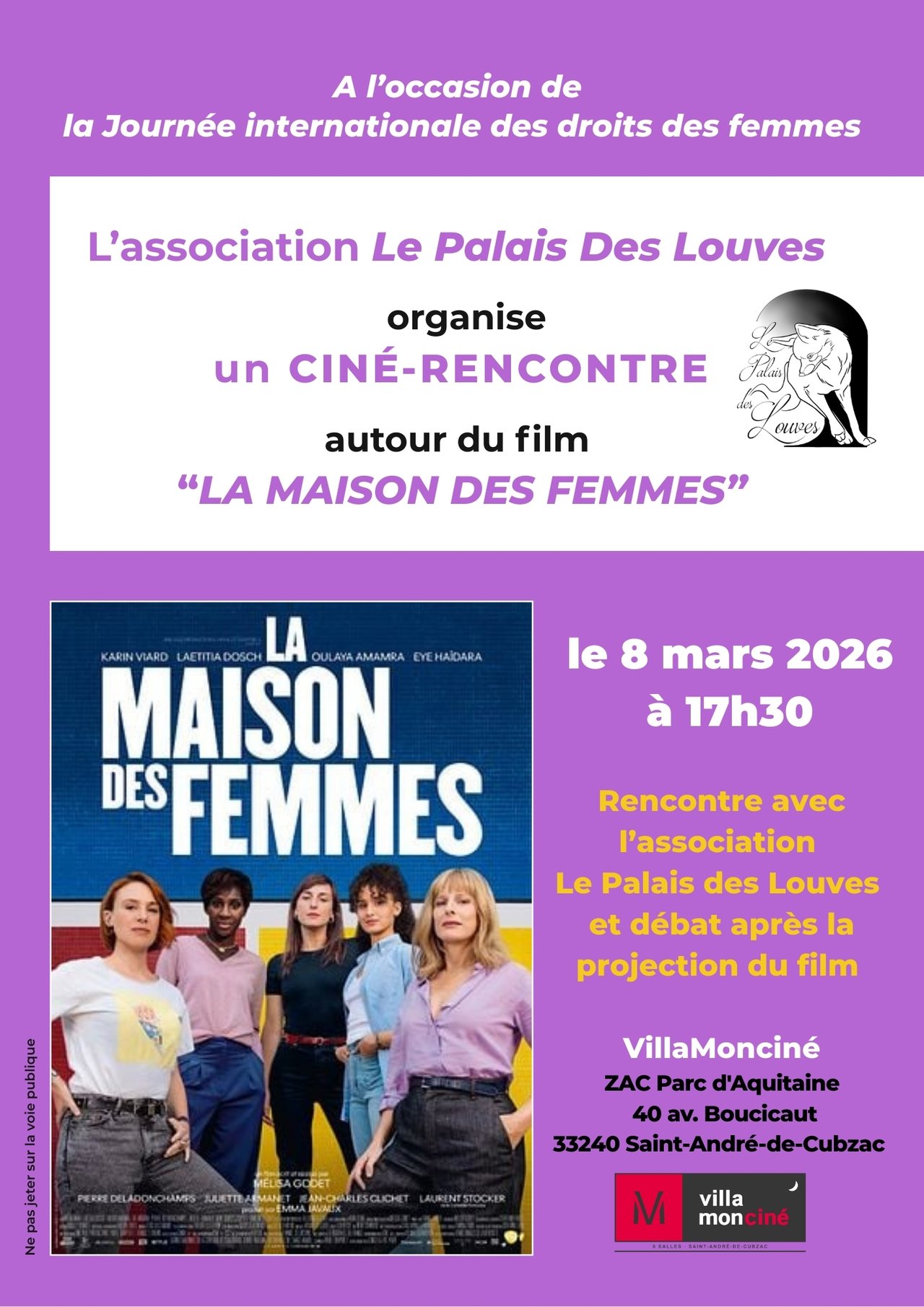 À l’occasion du 8 mars – Journée internationale des droits des femmes, le Palais des Louves vous invite à une soirée spéciale au cinéma autour du film « Maison des Femmes », choisi pour la similarité de nos actions et des valeurs que nous portons : accueillir, écouter, accompagner, protéger.