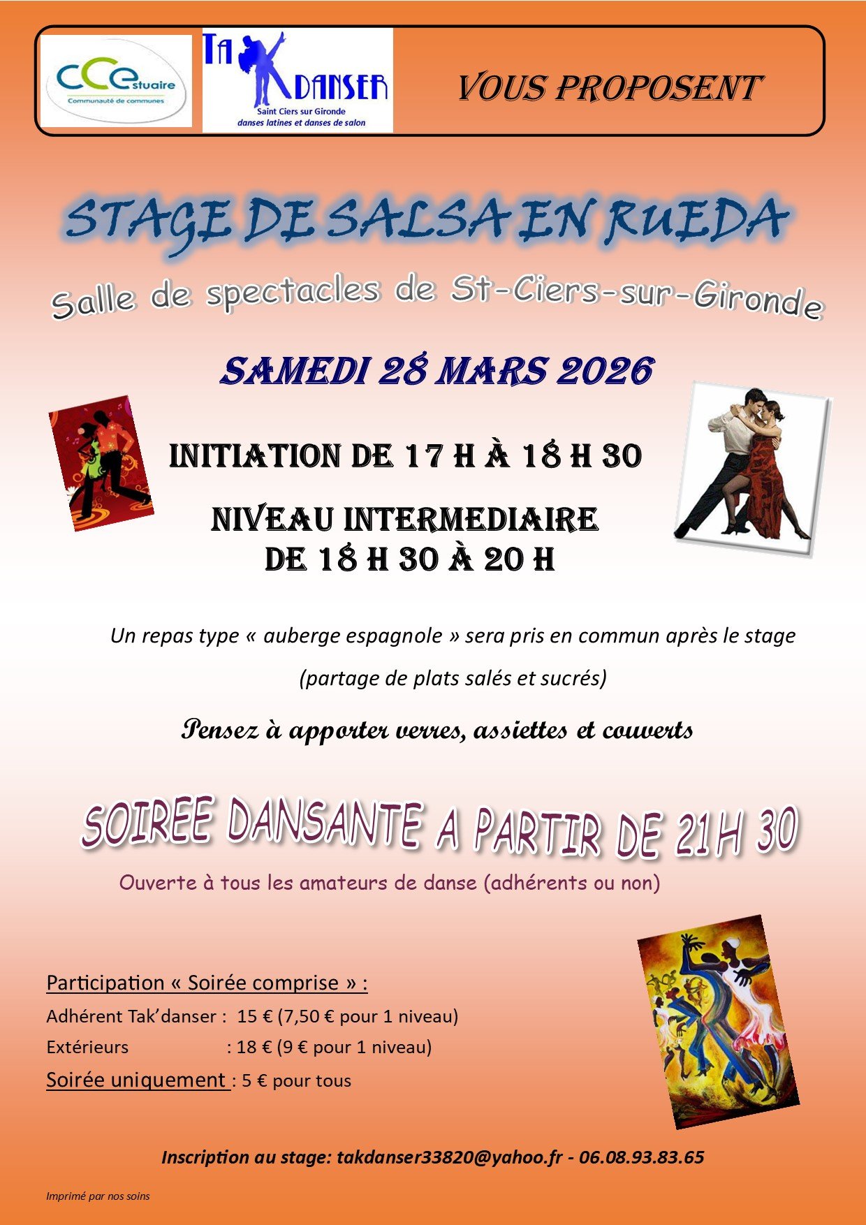 L'association Tak'danser propose un stage de salsa en rueda, samedi 28 mars prochain, à la salle de spectacles de Saint-Ciers-sur-Gironde, ouvert à tout public, licencié ou non à un club de danses de salon.