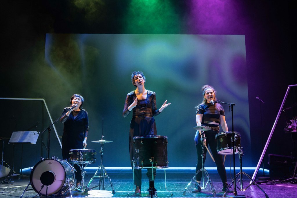 Sur scène la plasticienne franco-brésilienne Clara Chotil, la batteuse japonaise Yuko Oshima et Chloé Begou occupent pleinement le plateau, s’adressant directement au public, l’interpellant et l’immergeant dans un tourbillon d’énergie. À travers leurs vitalité et sororité, elles nous offrent une partition enivrante et inspirante à l’image des artistes dont elles portent les paroles.