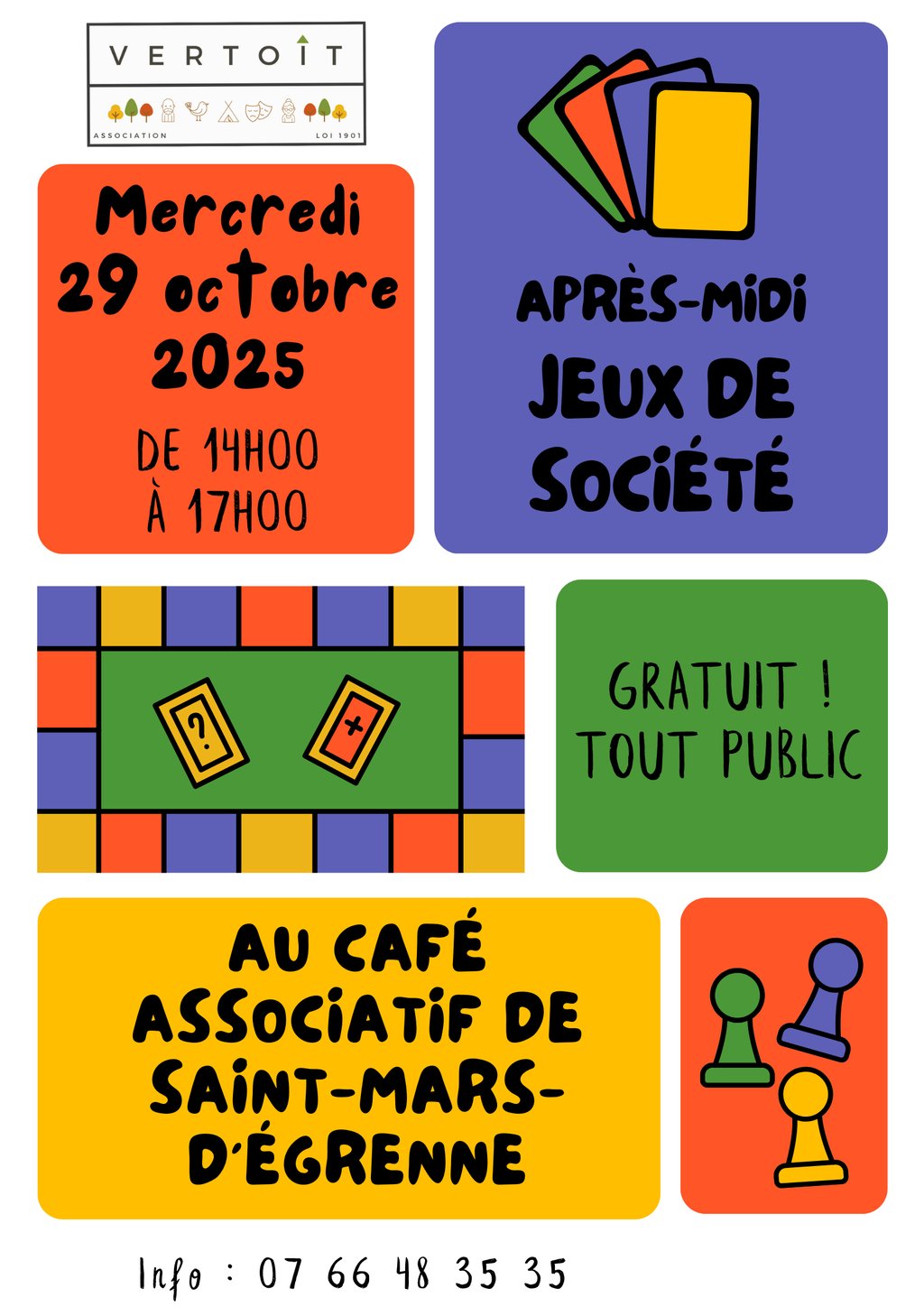 Nous serons heureux de vous accueillir au café associatif de Saint-Mars-D'Egrenne le mercredi 29 octobre de 14h à 17h pour un après-midi jeux de société !